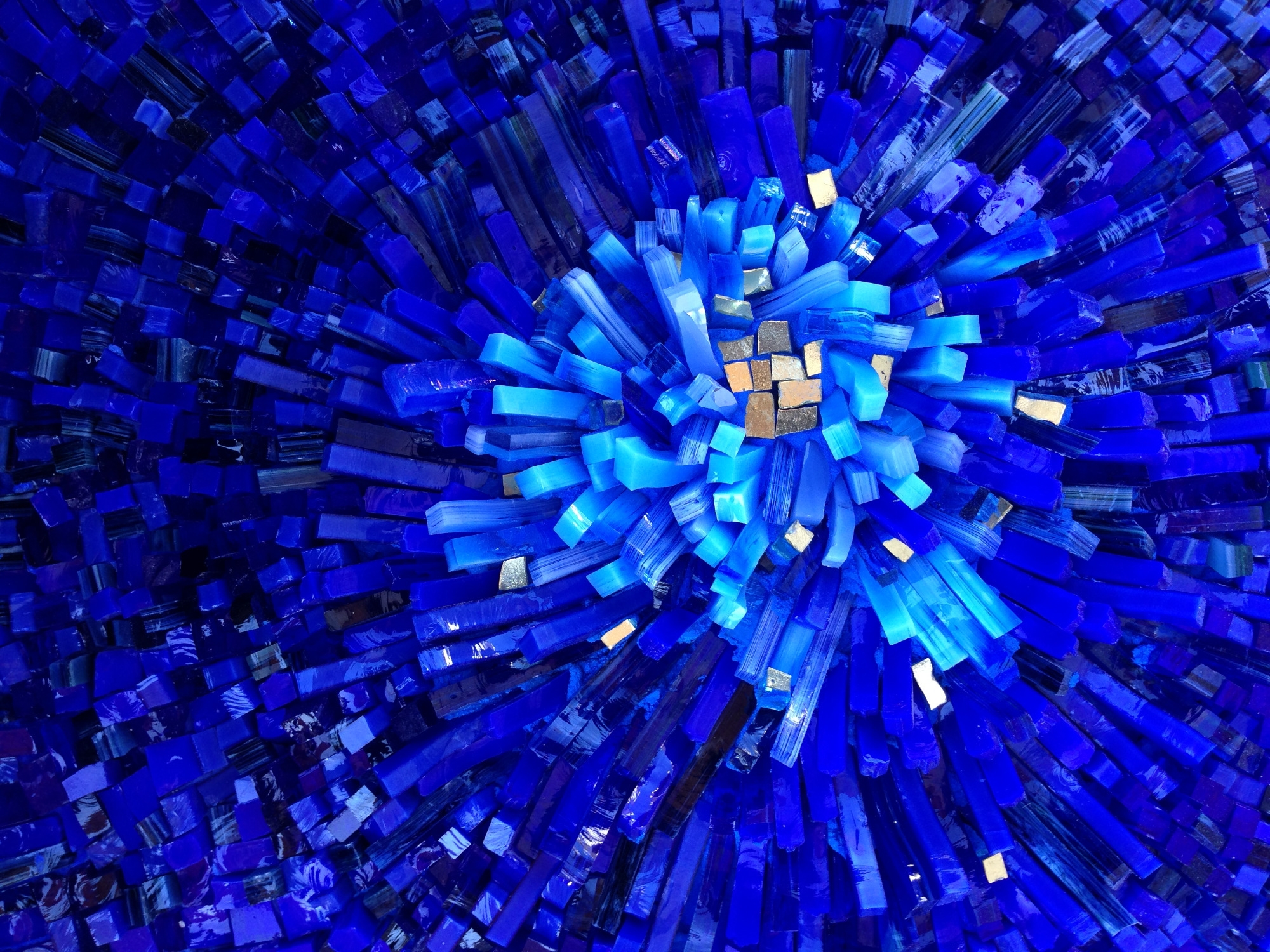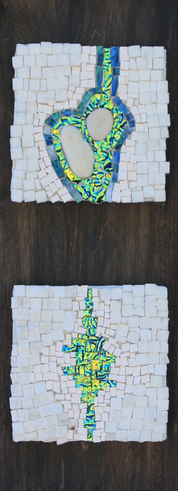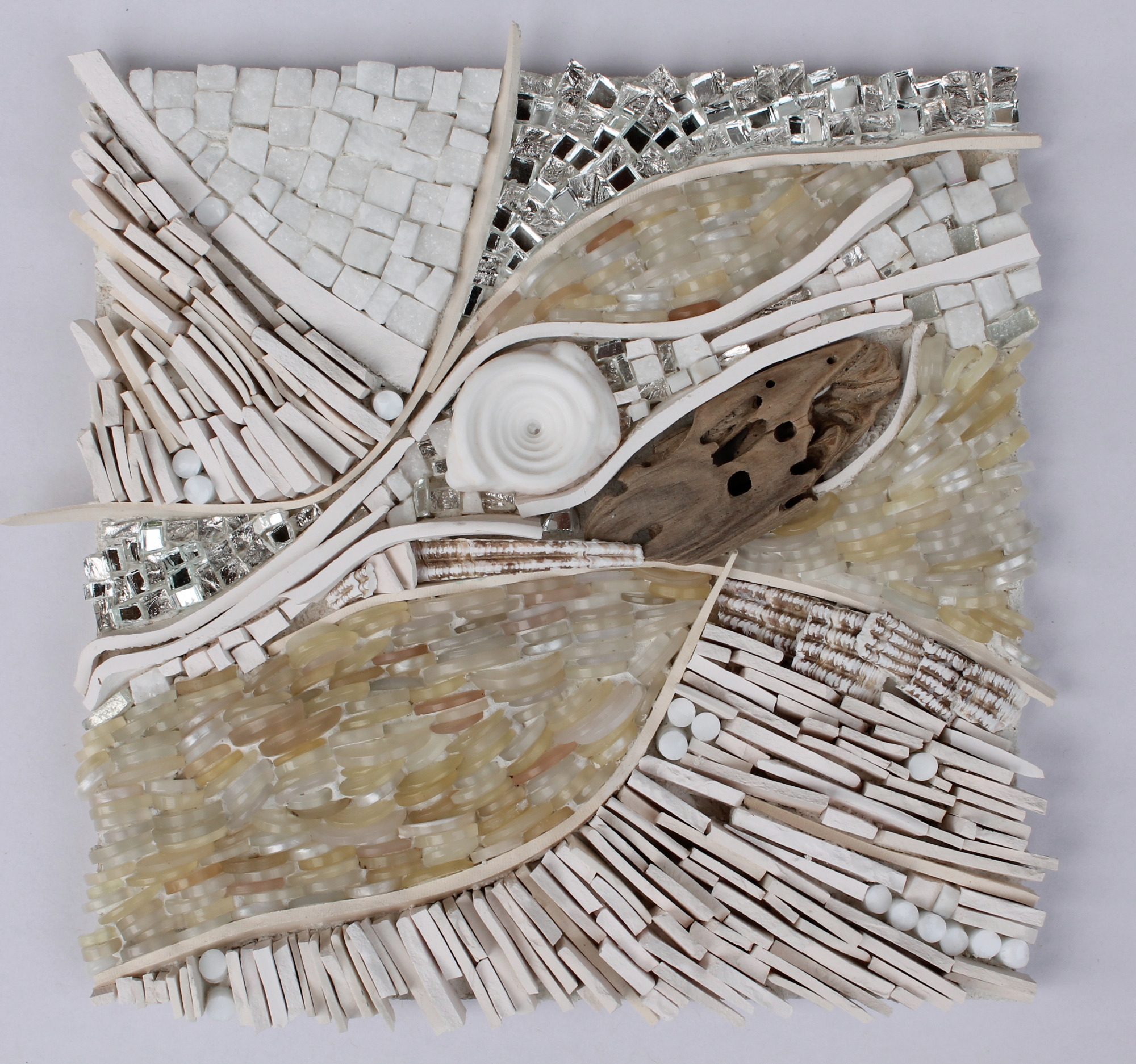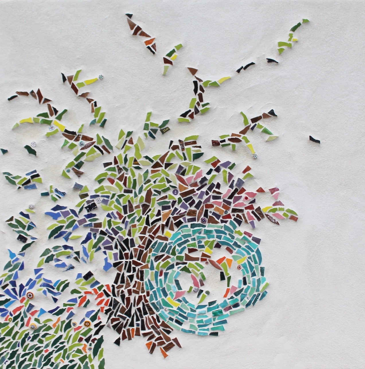 J’exploite les techniques traditionnelles de la mosaïque afin d’explorer la relation entre la texture et la lumière des matériaux et le processus de création. J’intègre des éléments simples et/ou recyclés en rencontre avec les matériaux traditionnels à la mosaïque pour leur redonner