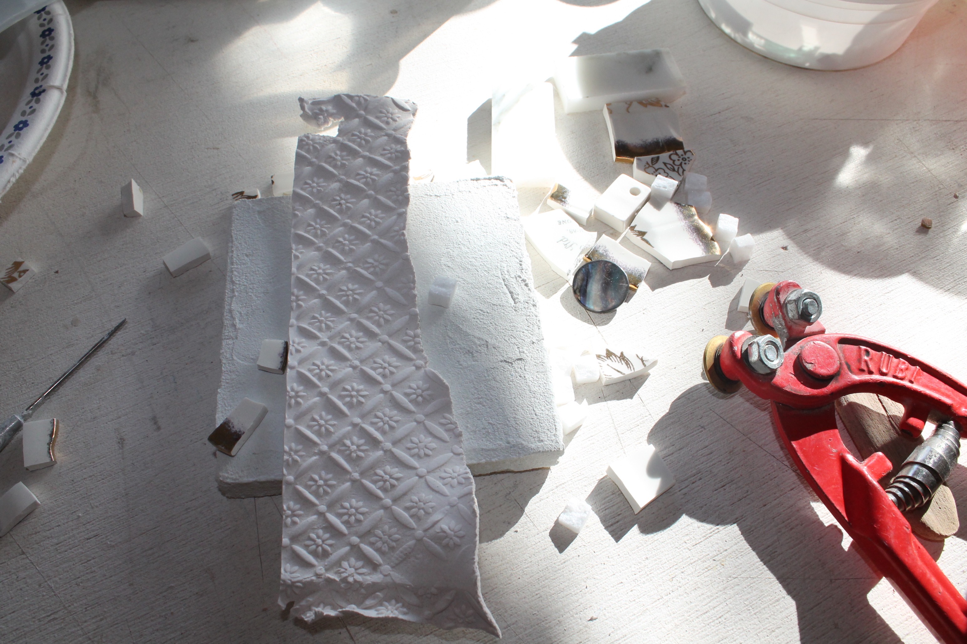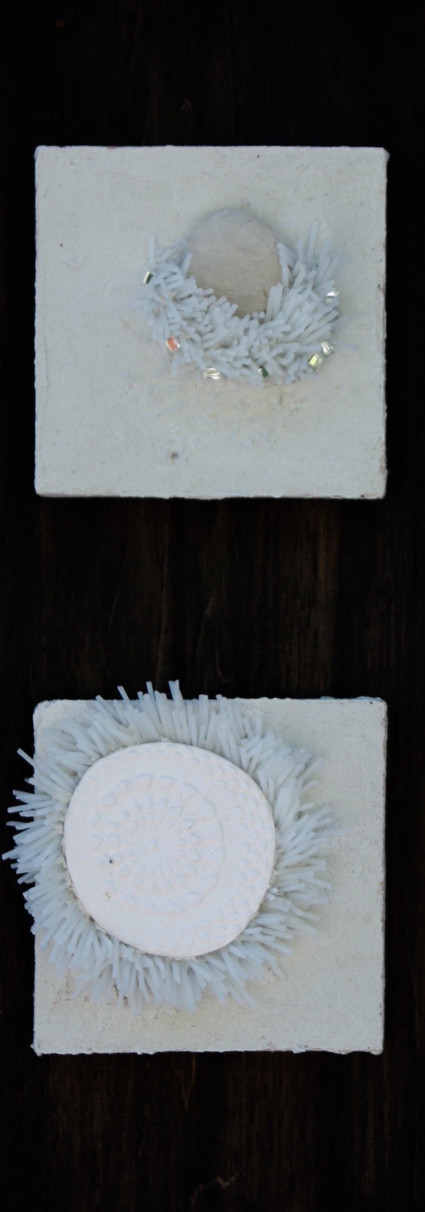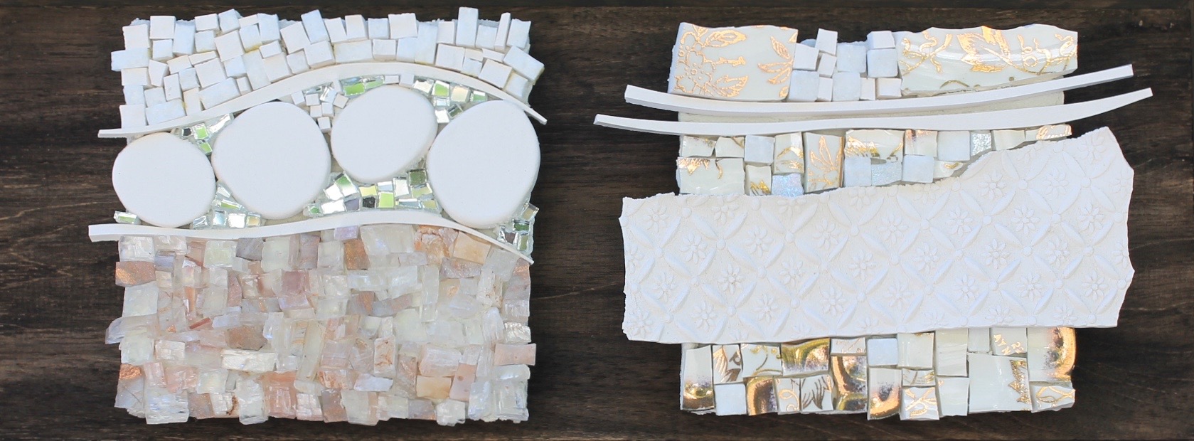 J’exploite les techniques traditionnelles de la mosaïque afin d’explorer la relation entre la texture et la lumière des matériaux et le processus de création. J’intègre des éléments simples et/ou recyclés en rencontre avec les matériaux traditionnels à la mosaïque pour leur redonner