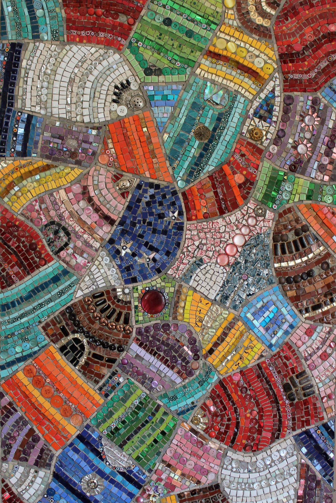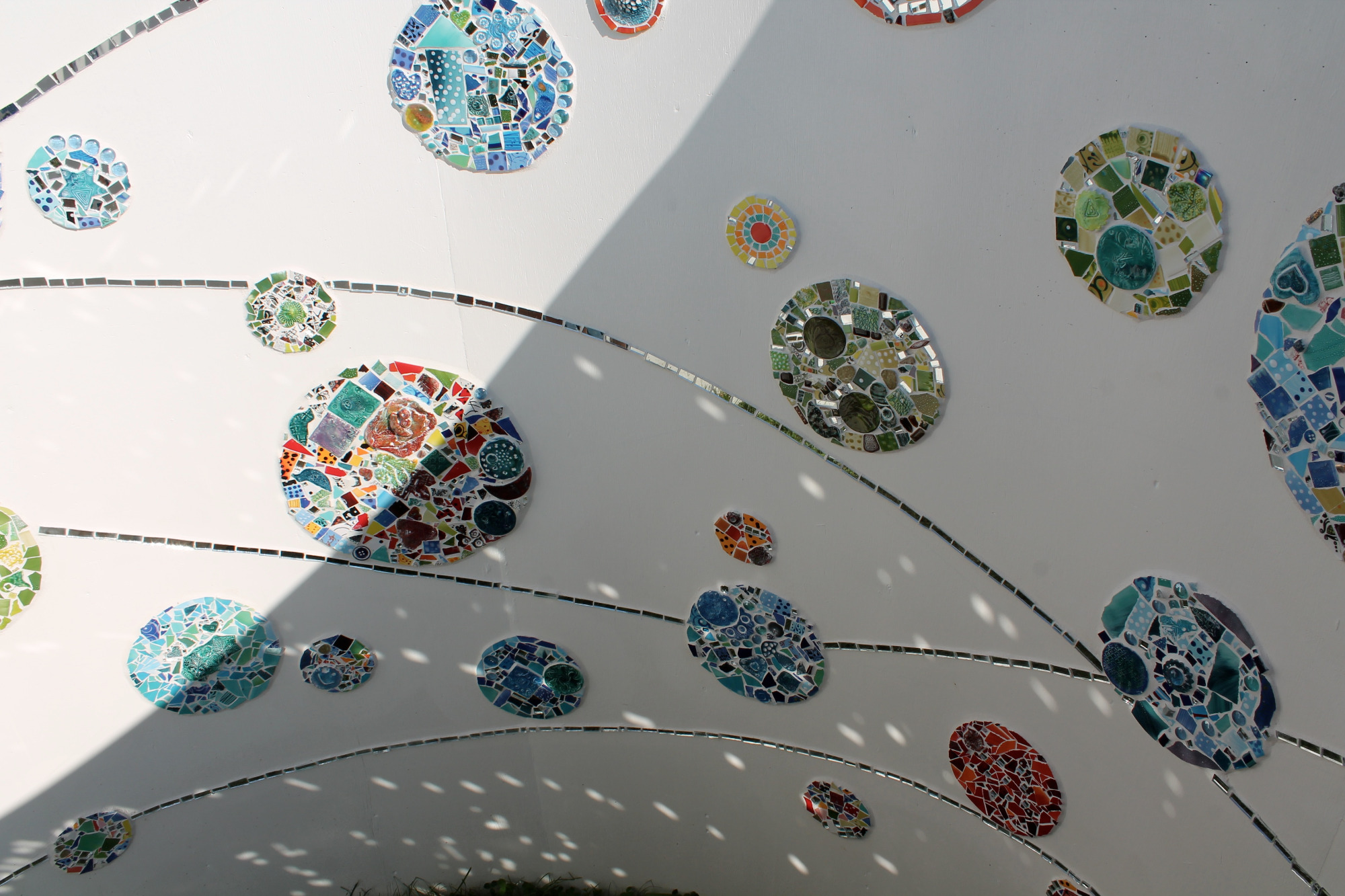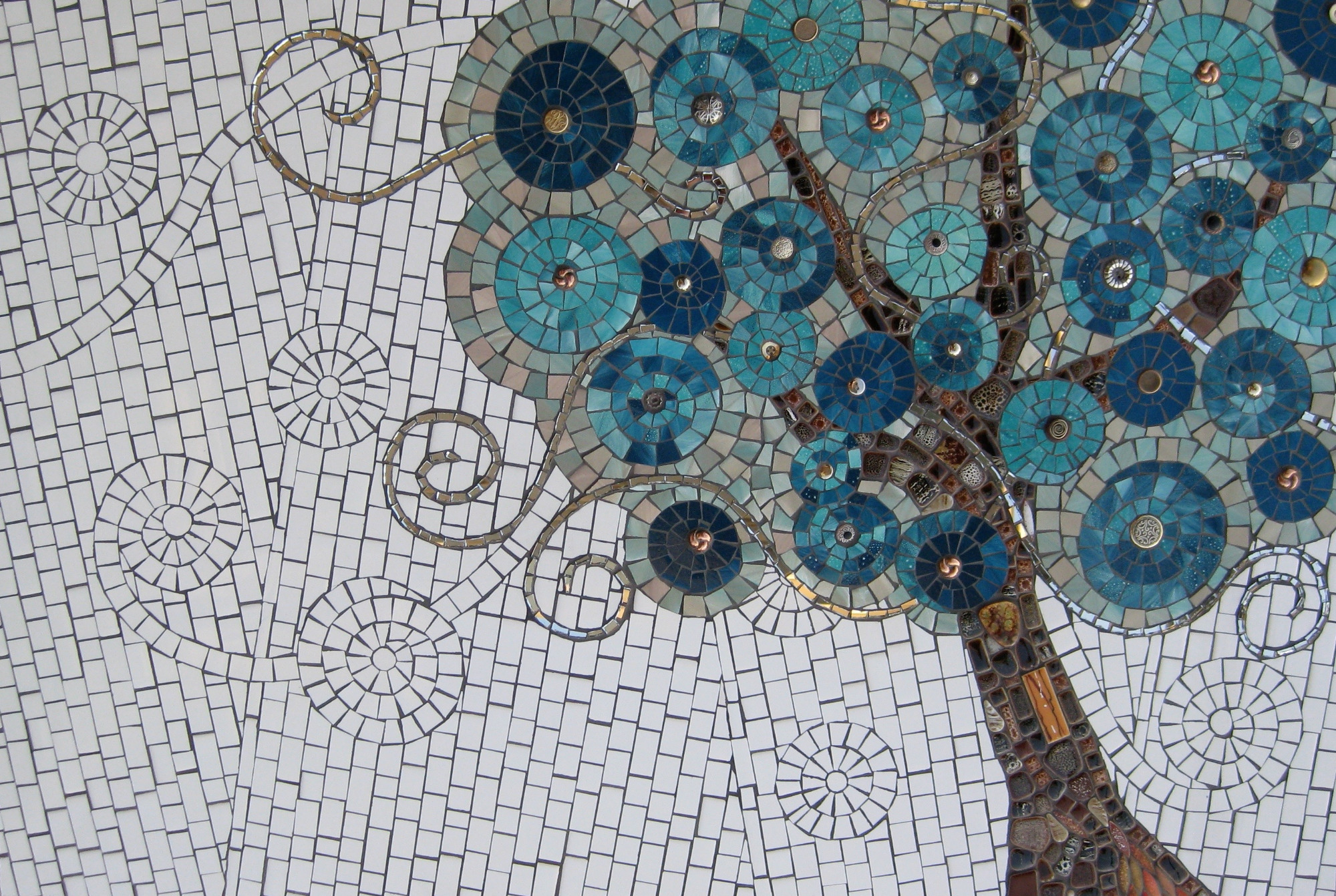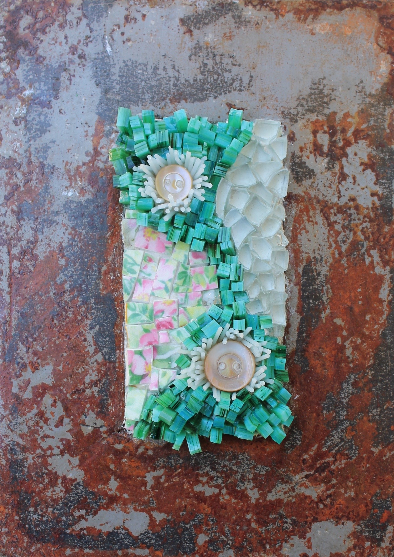 J’exploite les techniques traditionnelles de la mosaïque afin d’explorer la relation entre la texture et la lumière des matériaux et le processus de création. J’intègre des éléments simples et/ou recyclés en rencontre avec les matériaux traditionnels à la mosaïque pour leur redonner