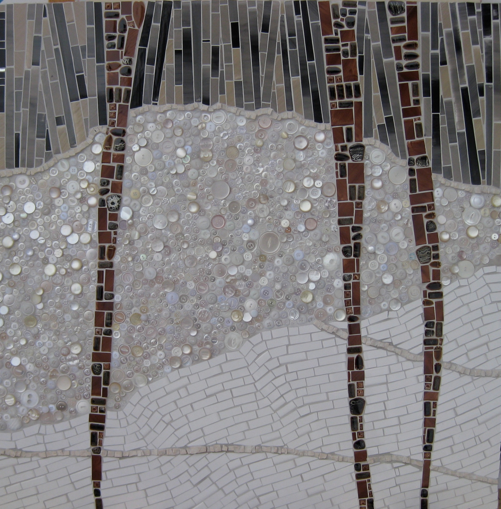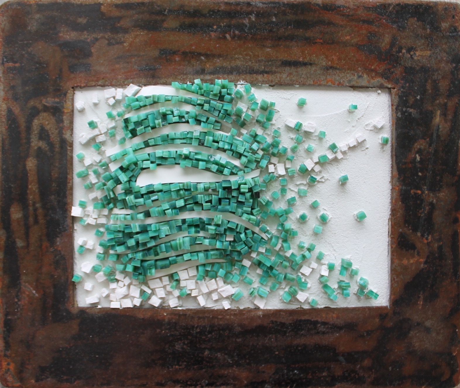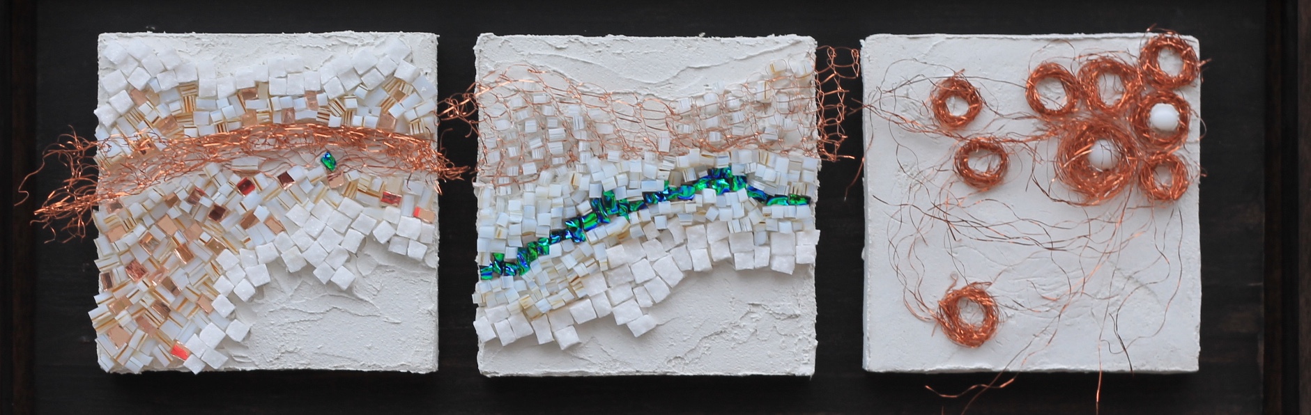 Je m'intéresse au lien entre la texture et le temps. Le processus de composition d’une pièce aucours duquel une tesselle perd sa singularité pour devenir l’élément constitutif d’un ensemble évoque chez moi la manière dont le temps magnifie les objets et les souvenirs.